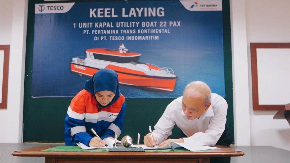 INVESTORBISNIS.COM – Proses pembangunan kapal Utility Boat 22 Paz resmi dimulai. Pembangunan ini merupakan hasil kerja sama antara PT Pertamina Trans Kontinental (PTK) bersama PT Tesco Indomaritim melalui proses keel laying di Galangan Tesco Indomaritim, Babelan, Bekasi.